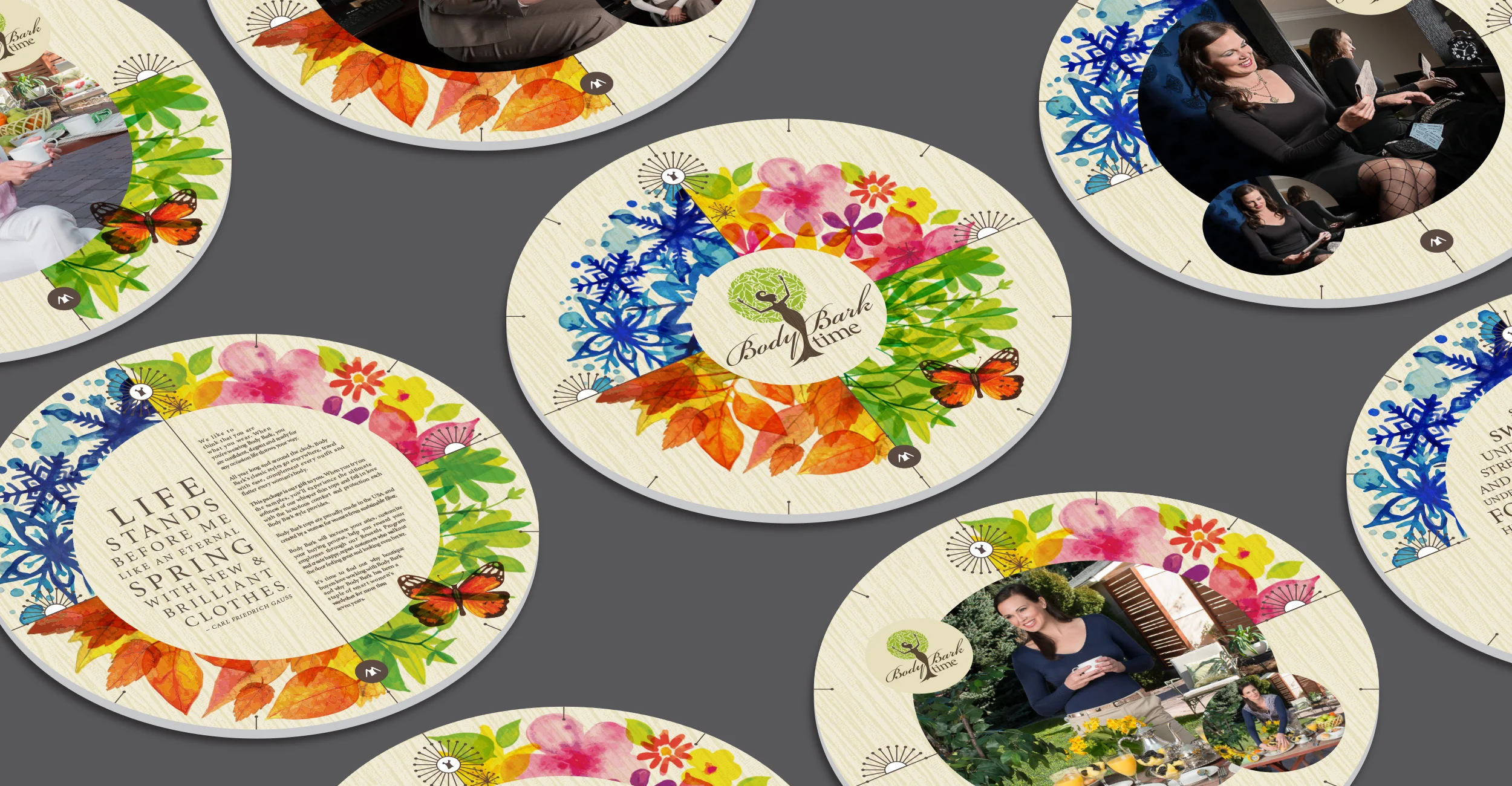 Inside the hat box with the Body Bark logo are several branded items. A colorful glass clock showed that “Body Bark Time” is all the time with illustrations of the seasons of the year and hours of the day. The theme of time is carried throughout the informational printed pieces shown below - all cut in a circle. Finally, three pieces of Body Bark apparel are included so each recipient can experience the fit and feel for themselves. The packages were a gigantic hit. Clocks are hung in countless shops and the brand is experienced a huge surge in recognition proving “Body Bark Time” is now!